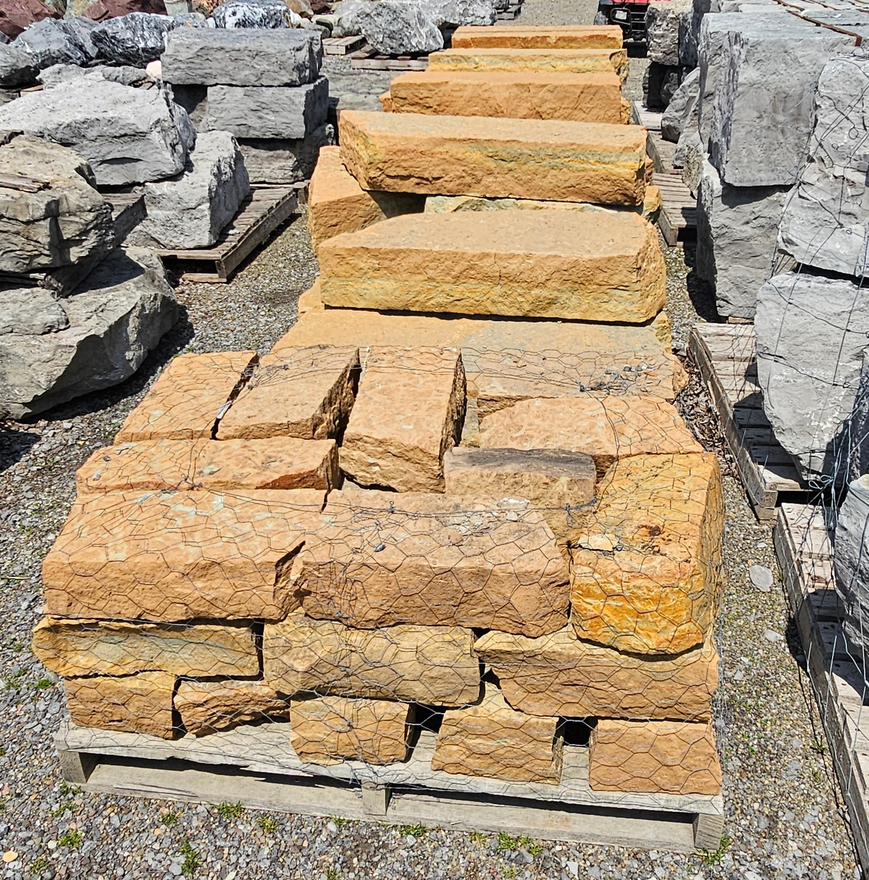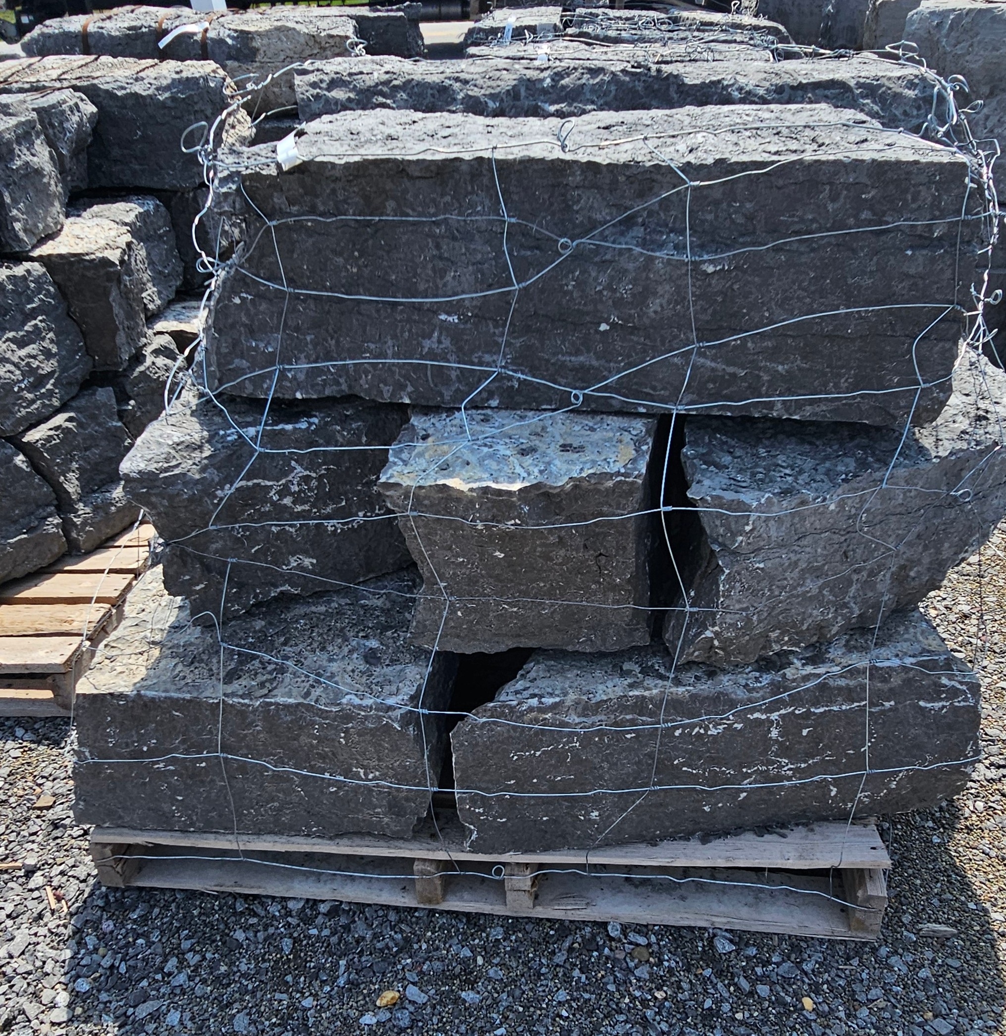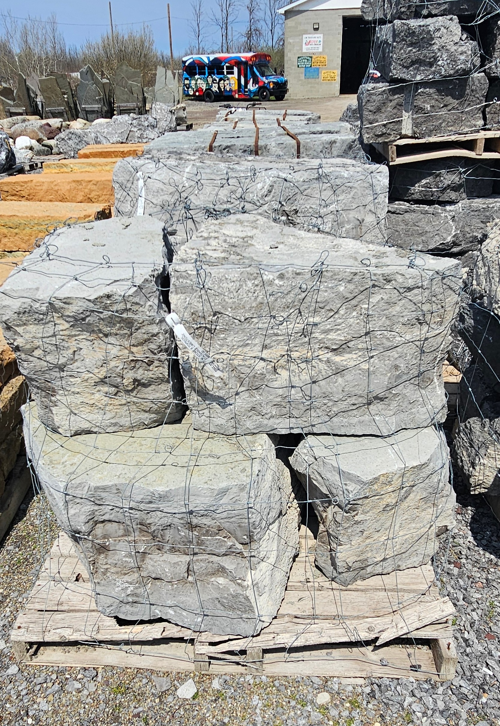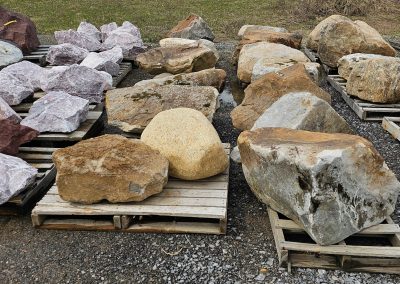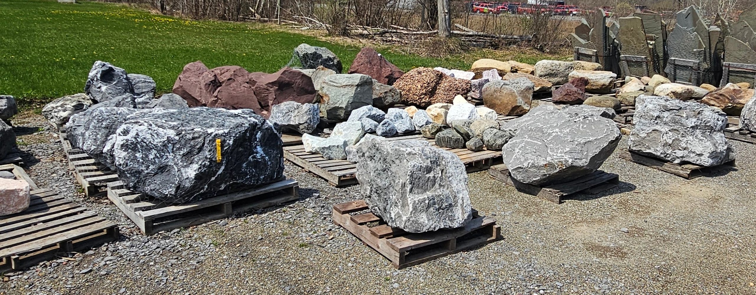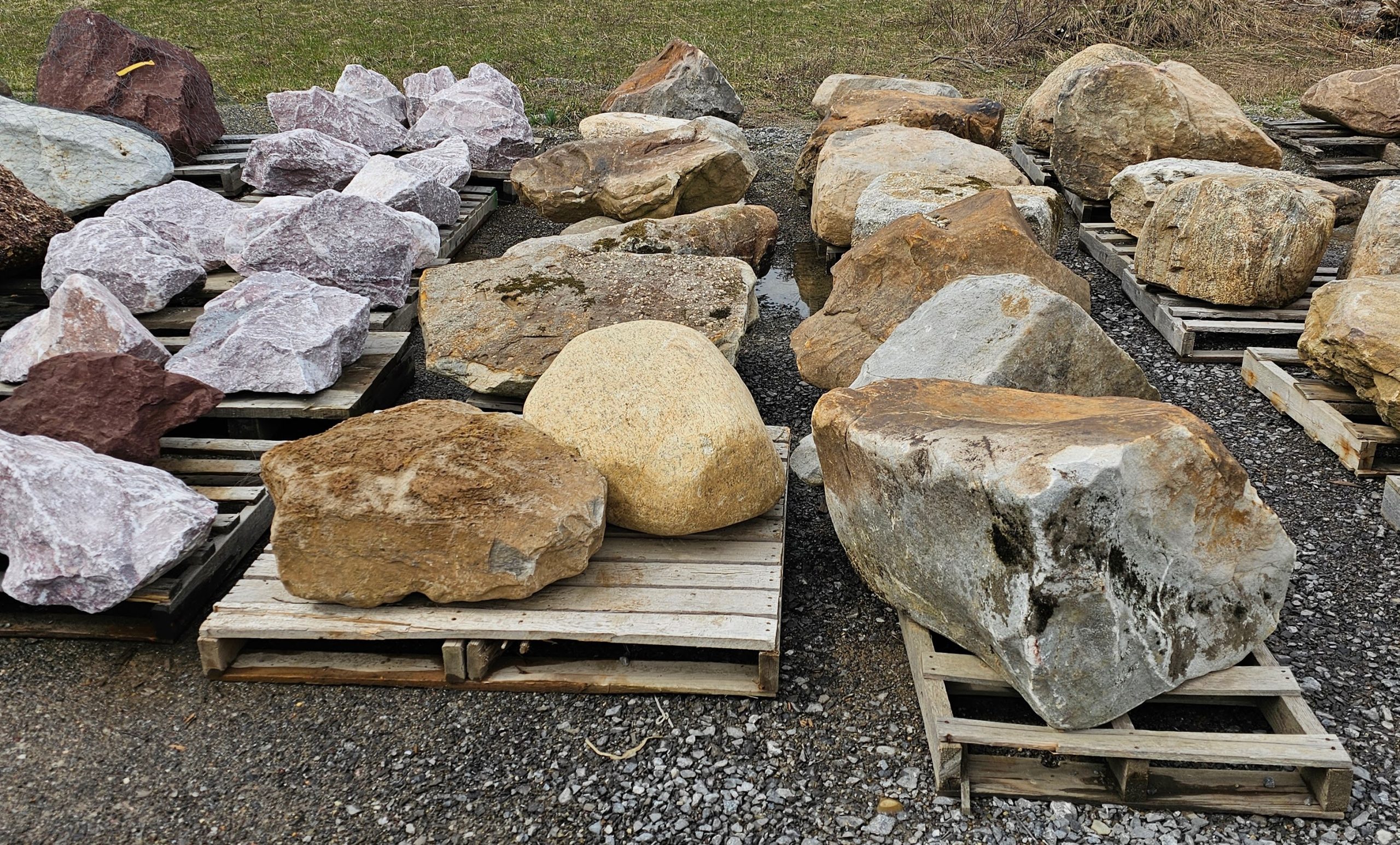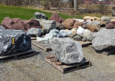 We have a large selection of Palletized Canadian Stackable limestone, palletized Guillotine Limestone , local crushed limestone boulder and decorative boulders available including White Marble, Tipple Red, Dixie Pink , Black Zebra and many more! We also have 2 big piles of oversized gravel that you can pick through for self-service from 3″ to 20″.